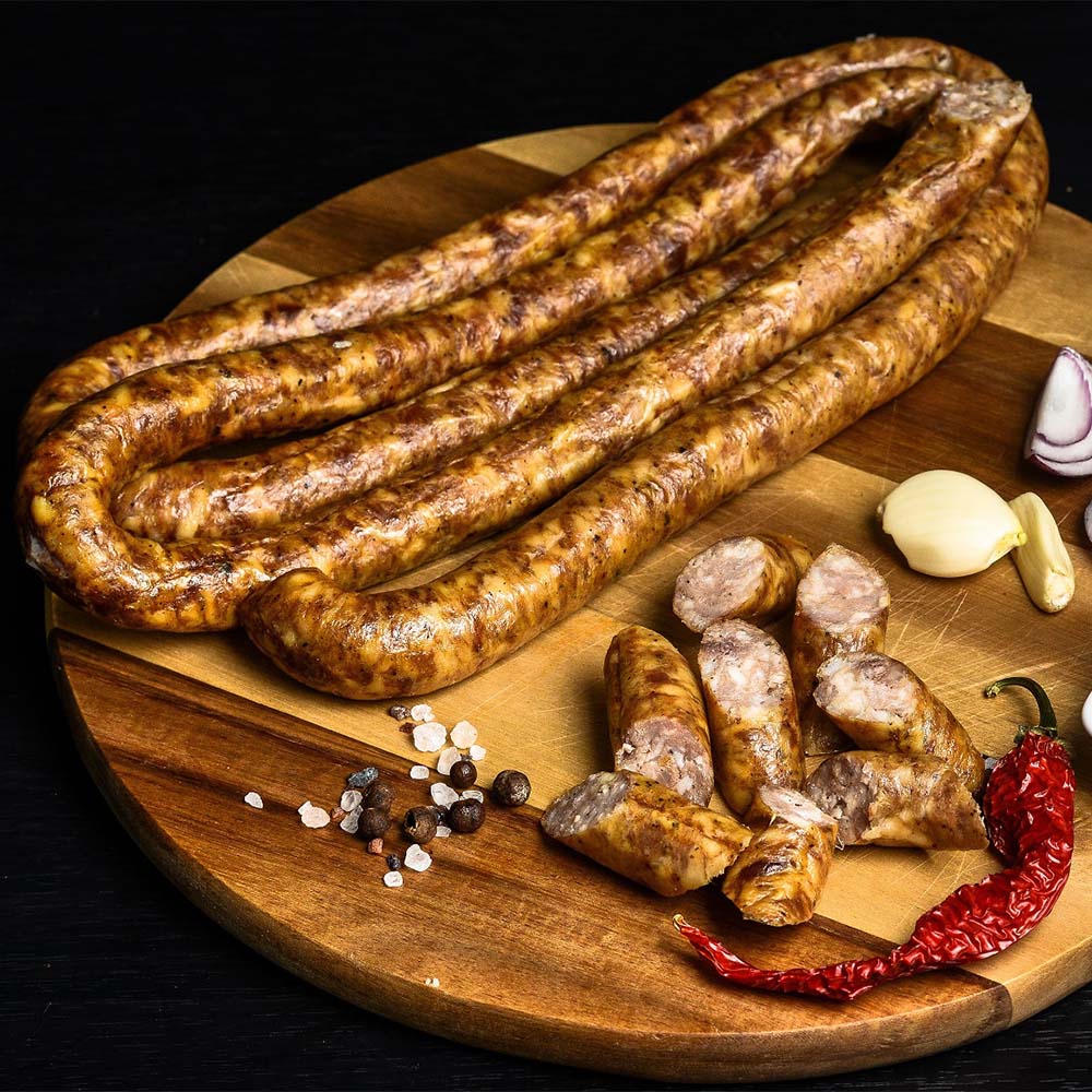 Cârnați tradiționali din zona Sibiului, preparați din carne atent selecționată, asezonați cu usturoi și condimente naturale, apoi afumați lent la lemn natural. Gust intens, echilibrat și autentic românesc – așa cum trebuie să fie!